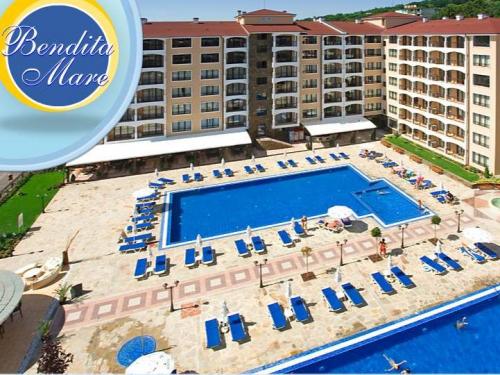 Бендита Маре является современным апарт-отелем, который находится всего в 50 метрах от пляжной зоны курортного комплекса Золотые Пески. Расположен на набережной аллее со всем разнообразием ее многочисленных магазинов, ресторанов, баров и аттракционов, и всего лишь в нескольких минутах ходьбы от центра курорта. Вблизи монастыря Аладжа (около 5 км), и ботанического сада г.Балчик (около 30 км.), а также в нескольким минутах от яхтенного порта курорта Золотые Пески. Регулярные автобусные линии - как до Варны, так и до Албены, Балчика и Добрича. Апарт-отель "Бендита Маре" предлагает богатую гамму услуг и сооружений, которые вместе с его чудесным расположением превращают его в идеальное место для полноценного отдыха.Апарт - комплекс "Бендита Маре" располагает 243 апартаментами, из которых 41 студия, 47 апартаментов с двумя спальнями и 155 с одной спальней, все апартаменты расположены на 7 етажах в двух отдельных зданиях. Все апартаменты с двумя или с одной спальнями имеют прямой вид на море, а все студии с видом на парк. Просторное фойе, приемная с 3 пассажирскими лифтами в одном здании и 4 в другом, итальянский ресторан а ля карт, предлагает также организованое питание туристов и их гостей на завтрак, обед и ужин, Бар у бассейна, 2 открытых бассейна и один детский, свободный шезлонгами и зонтиками на бассейн в комплексе, а также бесплатная парковка и CCTV для вашего автомобиля.К вашим услугам: Фитнес-зал, массажные кабинеты для лечебного и классического массажа, сауна, паровая баня, джакузи с зоной для отдыха, электролечение, грязелечение, маникюр и косметолог. Бильярд клуб и дартс. Волейбольное поле на пляже, возможности для занятий разнообразными видами спорта на пляже: гидроциклы, водные лыжи, водные велосипеды, банан, серф и мини гольф. Вблизи – яхтенный порт. За плату - телефон, факс, интернет, сейф, оплата по кредитным карточкам, такси, автомобили напрокат, химчистка и стирка, мини бар.